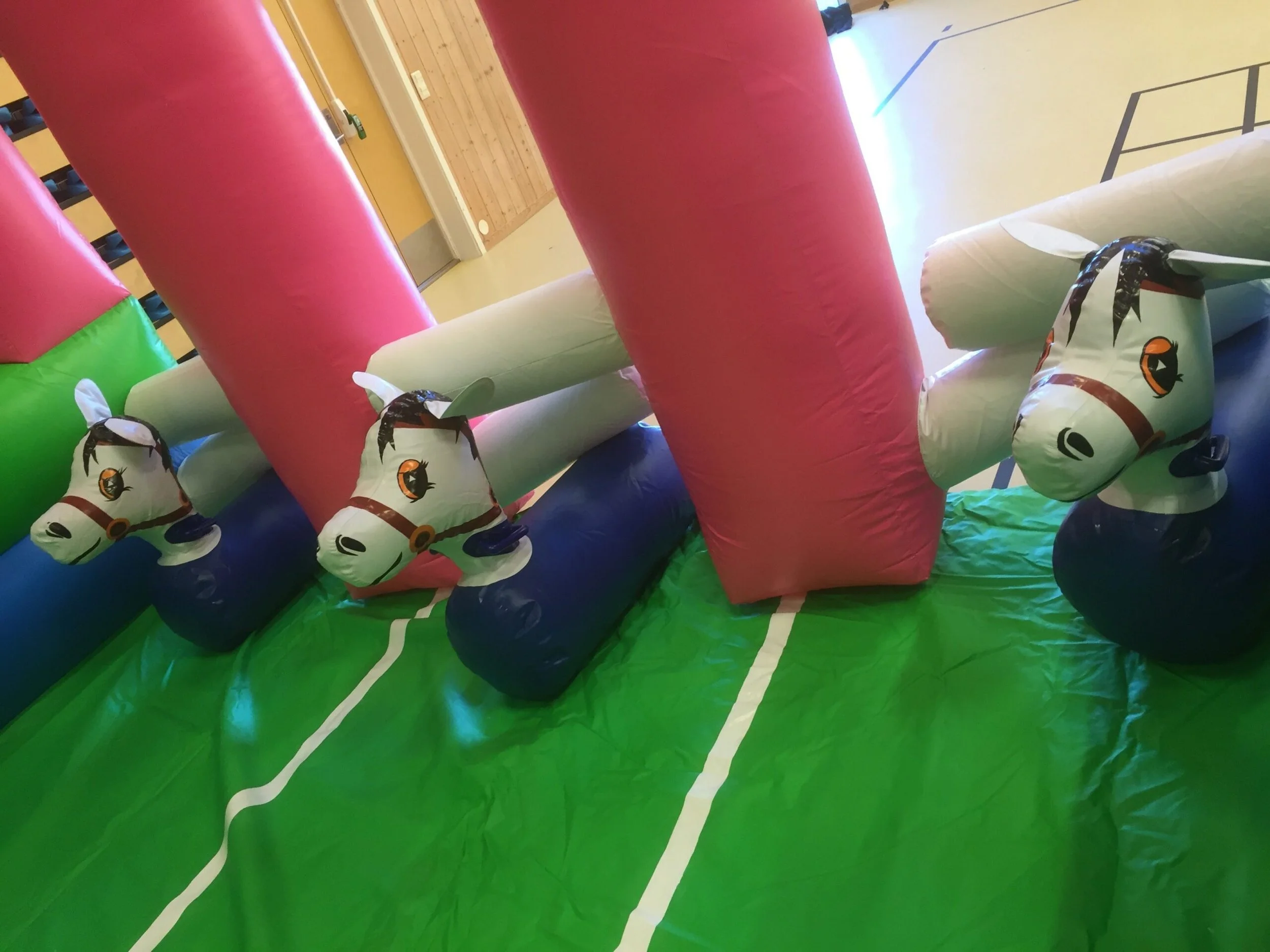 EN OPPBLÅSBAR LØYPE MED TRE BANER DER DELTAKERNE KONKURRERER PÅ STORE "HOPPEHEST"-PUTER. PRINSIPPET MINNER OM GAMLE HOPPEPØLSER – BARE MORSOMMERE OG MYE MER SLITSOMT. HER ER DET BENA SOM BESTEMMER FARTA. FØRST OVER MÅL VINNER!